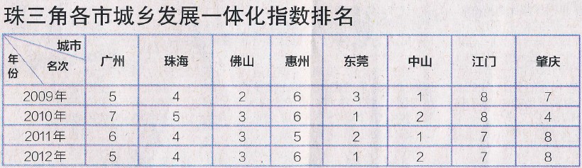 综合上述指标后,珠三角各市城乡一体化得分排名,依次为东莞、中山、佛山、珠海、广州、惠州、江门、肇庆。