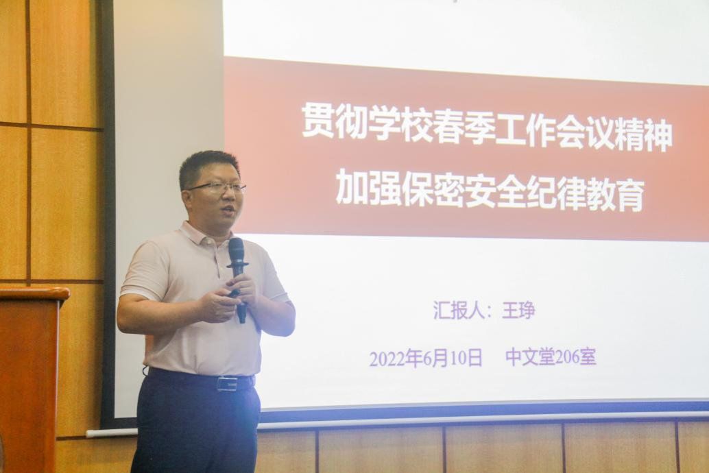 王琤书记带领全体教职工重温了习近平总书记“四有”好老师的要求,他表示,中文系要贯彻落实春季工作会议精神,坚持党的领导,结合新形势、新挑战,做好高层次人才引进和培养工作,深入理解通识教育与专业教育相融合、学科交叉融合等对人才培养工作的重要意义,深刻把握好国际化国际合作办学和扎根中国大地办学的辩证关系。王琤书记还对全体教职员工进行了保密、安全、纪律和师德警示专题教育。