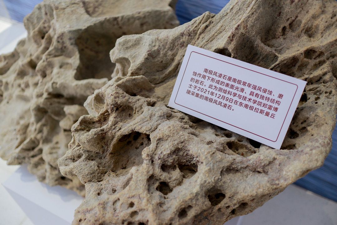 此次展览展出的南极风凌石,是中国第38次南极科学考察队队员、测绘科学与技术学院郑雷博士于2021年12月9日在东南极拉斯曼丘陵采集。南极风凌石是南极常年强风侵蚀、磨蚀作用下形成的表面光滑、具有独特结构的岩石,蕴藏了地质历史时期南极气候环境信息。