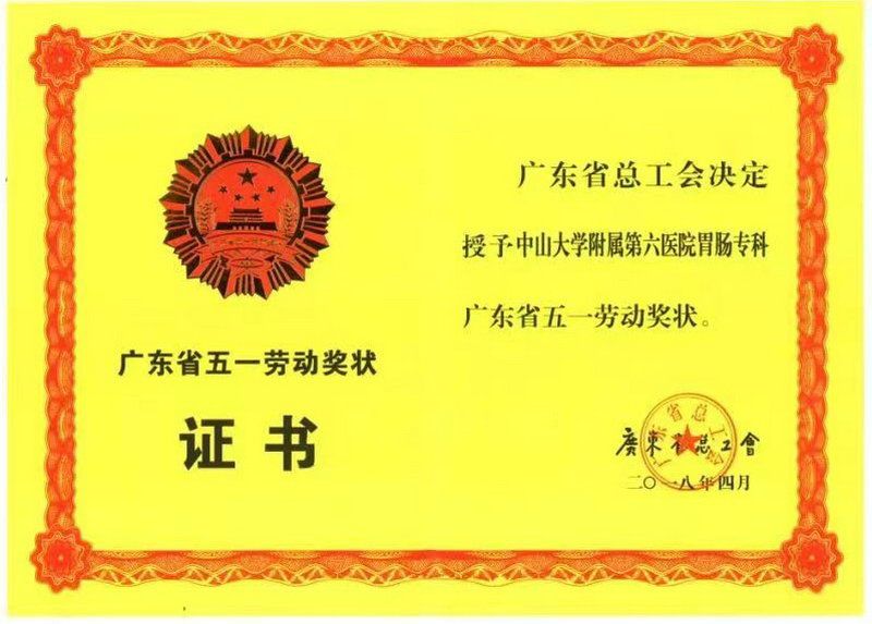 2018年,附属第六医院胃肠专科获广东省五一劳动奖状