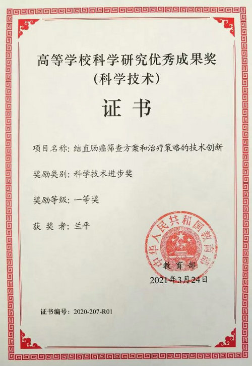兰平教授团队《结直肠癌筛查方案和治疗策略的技术创新》项目荣获教育部科研优秀成果奖科技进步奖一等奖