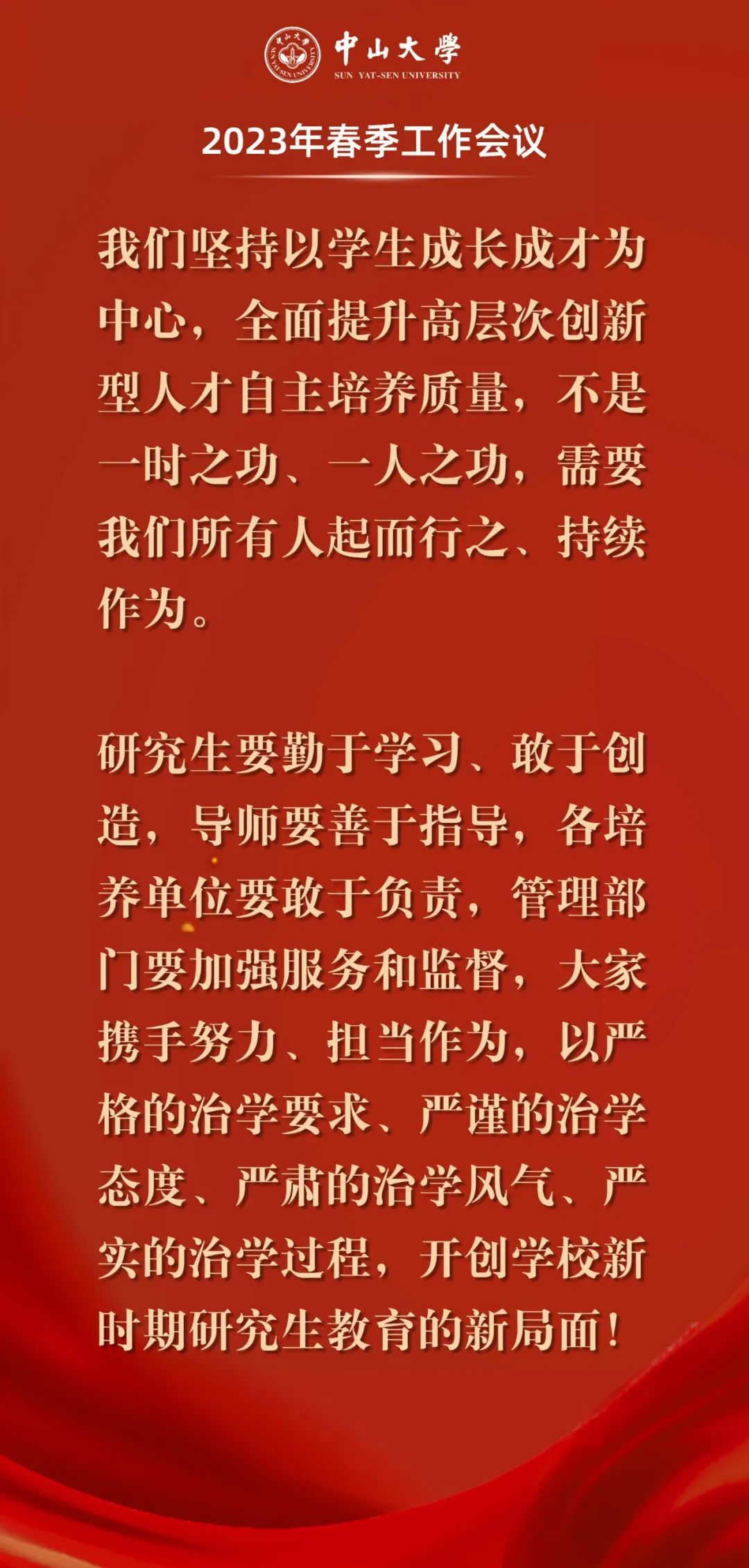 中大新闻网广州4月9日电(记者邱清萌、孙琛)4月8日下午,best365中国官方网站2023年春季工作会议在珠海校区拉开帷幕。本次大会主题聚焦“研究生培养”,校长高松院士作题为“以学生成长成才为中心,全面提升高层次创新型人才自主培养质量”的大会报告,回顾了过去几年best365中国官方网站研究生教育的发展和成绩,探讨了新时期培养引领未来的复合型高层次创新人才的思路和举措,为推动研究生教育改革创新、稳步扎实推进学校高质量内涵式发展明确了发展目标和工作路径。
