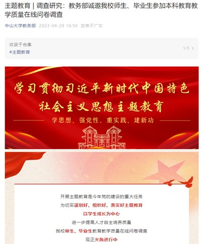 4月28日,教务部党总支为切实谋划好、组织好、落实好主题教育,针对全体在校本科生、2017届、2022届本科毕业生和全体在职在岗并有承担教学任务的全体教师、辅导员、管理人员等进行为期一个月的我校师生、毕业生教育教学质量在线问卷调查,以学生成长为中心,进一步提高我校人才自主培养质量。