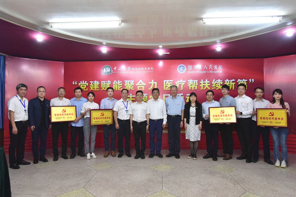 为进一步发挥党建引领作用和样板支部示范作用,孙逸仙纪念医院心血管内科教职工第二党支部、神经科教职工党支部,神经外科教职工党支部、急诊科党总支、医务教职工党支部、耳鼻喉科教职工党支部与揭西县人民医院临床第一党支部、临床第二党支部、门诊第二党支部和行政党支部开展支部结对共建活动。现场领导嘉宾共同见证两家医院党支部结对共建授牌。