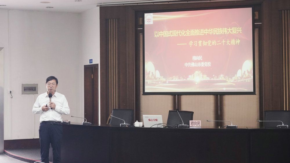接下来,中共佛山市委党校经济学教研部主任、佛山市社科专家库专家穆向民副教授作《以中国式现代化全面推进中华民族伟大复兴——学习贯彻党的二十大精神》专题讲座。围绕“历史探索与理论创新、问题指向与内在超越、实践逻辑与区域策略”三个方面,对以中国式现代化全面推进中华民族伟大复兴进行系统、全面、深刻的阐述,深入阐释党的二十大报告的实质内涵,引导学员们领会中国式现代化的内涵和实现路径,深刻理解和把握习近平新时代中国特色社会主义思想。