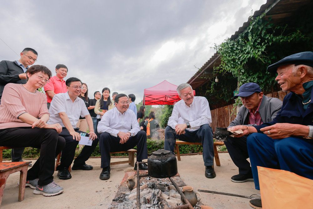 在小湾镇锦秀村,陈春声书记、高松校长一行调研凤庆茶文化、茶产业、茶科技发展情况,以及学校支持的乡村振兴示范点建设情况。在凤山镇京竹林村二道河自然村,陈春声书记、高松校长围绕当地挖掘区位优势和自然资源、带动百姓就地务工进行了深入调研和交流。