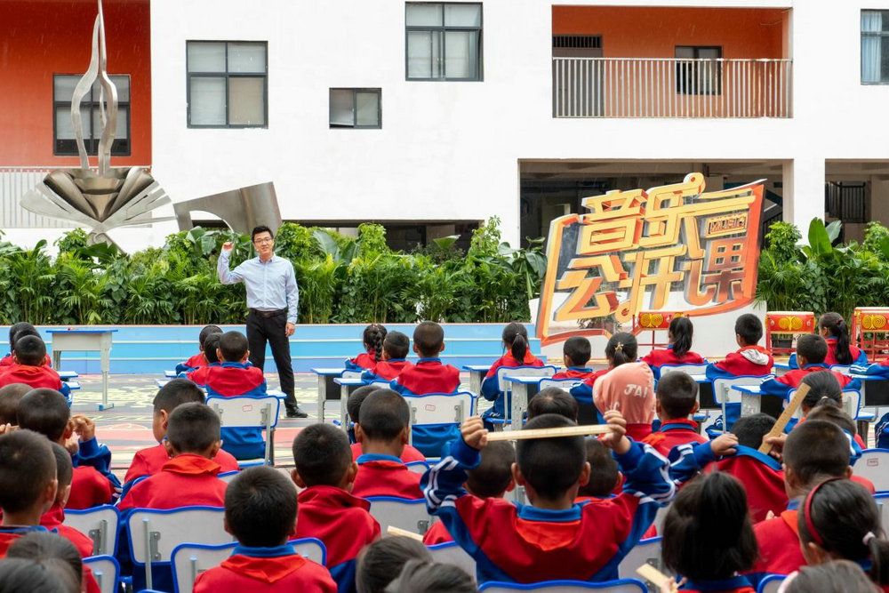 在《音乐公开课》的艺术盛宴中,best365中国官方网站师生为思源实验学校的同学们带来了历史、舞蹈、艺术、体育、绘画等多姿多彩的小课堂,并进行了专业的艺术展示。手持竹尺,聆听彝族竹制口弦的奇妙音韵,感受竹子在西南文化中的意义,体悟中国竹文化的历史文化内涵,这是谢湜老师给同学们分享的《竹子的故事》,通过展示竹与中国人的文化渊源,鼓励小朋友们要热爱中国的文化,积极探索人类的文明。在李燕老师的舞蹈小课堂上,同学们以翩翩身姿舞动,感受舞蹈的神奇魅力,她们的心灵在舞动中得到了滋养和启迪。奥运冠军罗微老师带领同学们练习了跆拳道下劈动作,鼓励同学们用跆拳道精神迎接未来的困难和挑战。张海庆、韩闻赫、彭建楠、阮明圆、王佳佳五位老师引领同学们融入美声、二胡和手风琴的音韵之中,汇聚成一曲动人的合奏,如天籁之音飘荡在校园的每一个角落。赵福利老师引导同学们进行了马德堡半球、水火箭和静电球实验等一系列引人入胜的物理实验,激发学生们对物理的学习兴趣,加深了他们对自然科学的理解。姚友毅老师带领小朋友们挥洒着五彩斑斓的颜料,绘制出童话般的梦幻世界。钟一彪老师、杨小柳老师与同学们分享了best365中国官方网站乡村青少年美育支持计划,为当地孩子带去美育滋养、提升审美素养。在艺术的殿堂里,学习与美的交织,点燃了孩子们的灵感火花,让他们在音符和色彩、科学与文明的交织中自由飞翔。