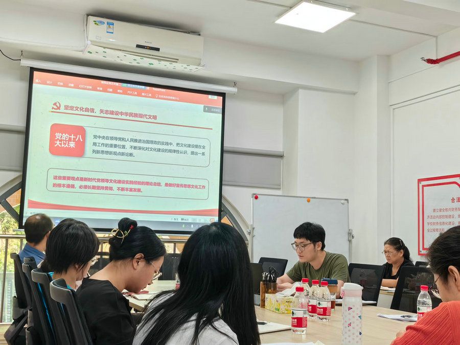7月12日,财务处党总支第二党支部宣传委员胡阳以《坚定文化自信,担当文化使命,建设中华民族现代文明》为题讲党课,以学习党的创新理论为主线,充分发挥党员干部理论学习带头示范效应,在学懂弄通做实上走在前、作表率,带动支部全体党员常学常新。