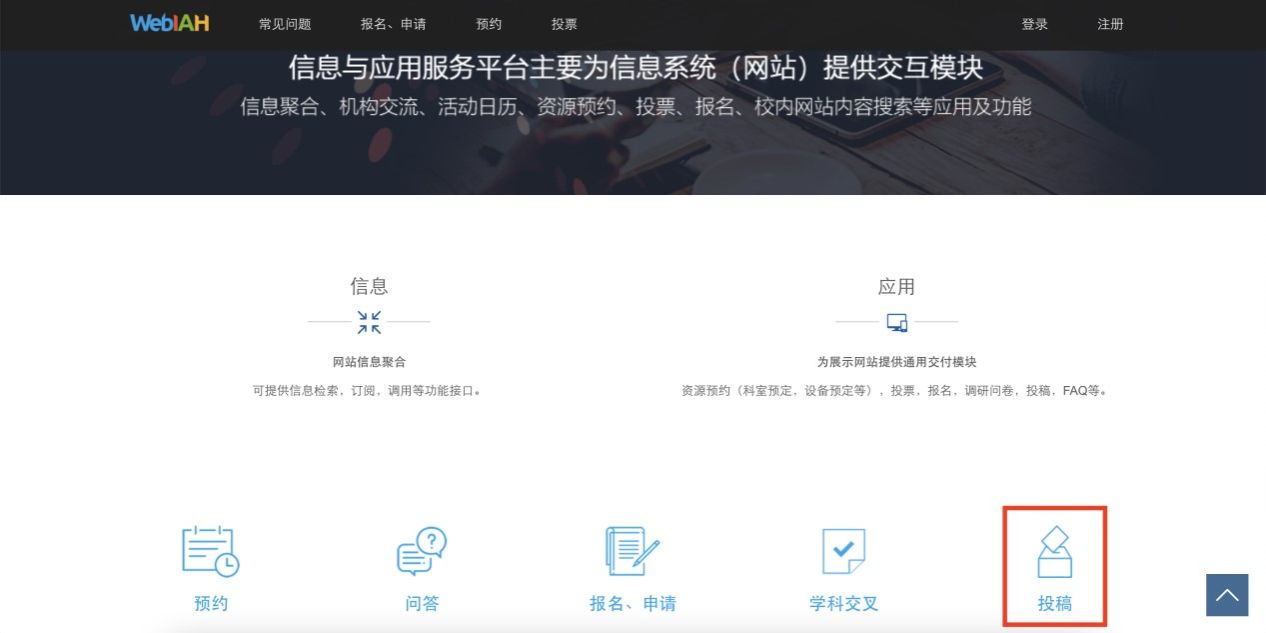 信息与应用服务平台首页右下角为投稿系统入口
