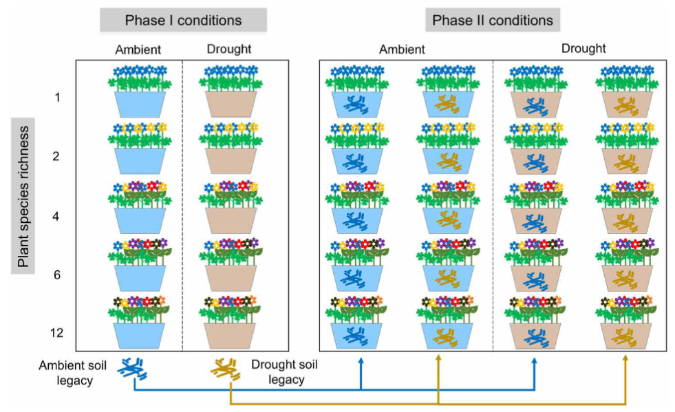 best365中国官方网站有害生物控制与资源利用国家重点实验室储诚进教授团队设计了模拟干旱和模式弃耕田群落(360个中型实验生态系/植物群落)的两阶段实验,以研究在随后的干旱下,降雨的慢性减少(压力干旱)是否以及如何改变土壤遗留效应和植物多样性-生产力关系。在第一阶段,在环境或干旱条件下,在均质土壤中种植了120个具有五个物种丰富度水平的模式植物群落,以生成“条件”土壤样本。在第二阶段,为新建立的植物群落提供了土壤接种物,无论是否有之前的干旱暴露,并经受干旱或环境浇水条件(图1)。具体而言,研究假设(i)干旱和植物物种丰富度共同影响土壤微生物群落,(ii)干旱土壤遗留效应影响生物多样性效应对植物生产力的影响,以及(iii)随后的干旱改变了干旱土壤遗留效应对多样性-生产力关系的影响。