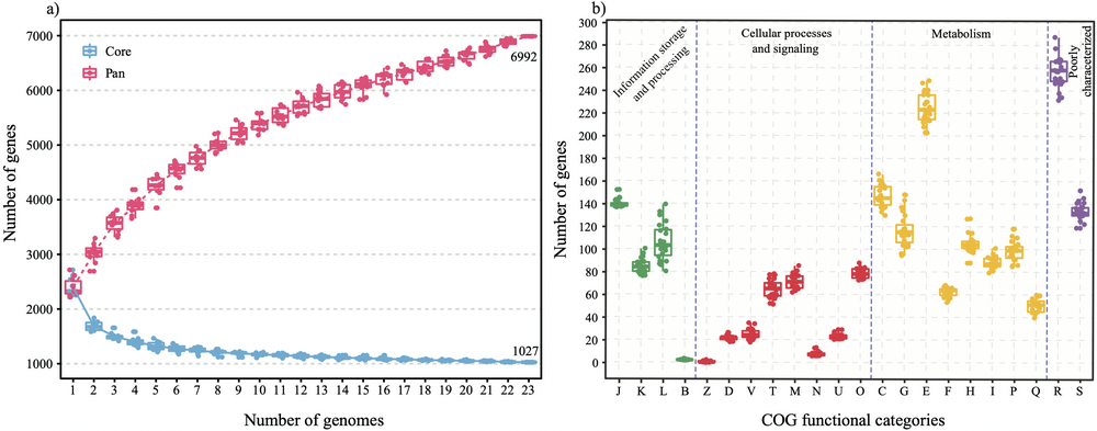 团队通过比较基因组分析发现,Thermus类群的基因组大小在2.02 Mbp-2.56 Mbp之间,泛基因组包含6992个基因家族,其中有1027个核心基因家族(图1);此外,COG功能注释结果表明,Thermus类群具有十分相近的功能类别。因此,尽管Thermus属典型物种较多,分离地点差异较大,但是整体功能较为保守。