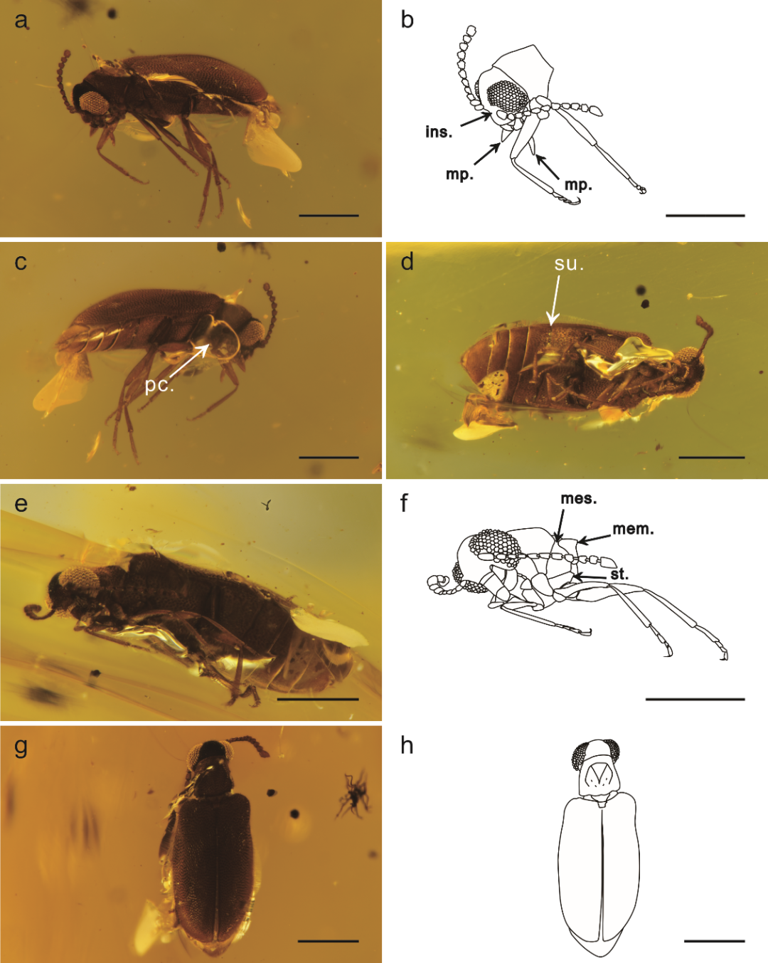 与现生亲缘属种相比,G. wukong在形态上并无太大差异,可以推测此类甲虫的生活环境与习性自白垩纪以来相对稳定。值得注意的是,现生属Euglenes与G. wukong系统学关系较为密切,主营腐食生活,对化石种的古生态研究具有重要参考意义。本研究发现进一步丰富了缅甸琥珀森林里腐生甲虫的多样性,体现出此时的生态系统已取得进一步发展。
