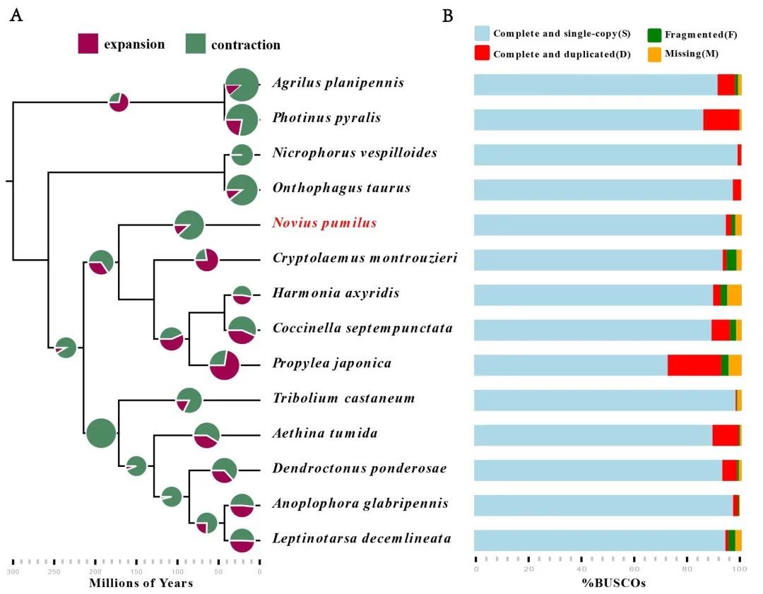 图1 小短角瓢虫与其他甲虫基因家族的扩张收缩统计(左)与基因组完整度(右)