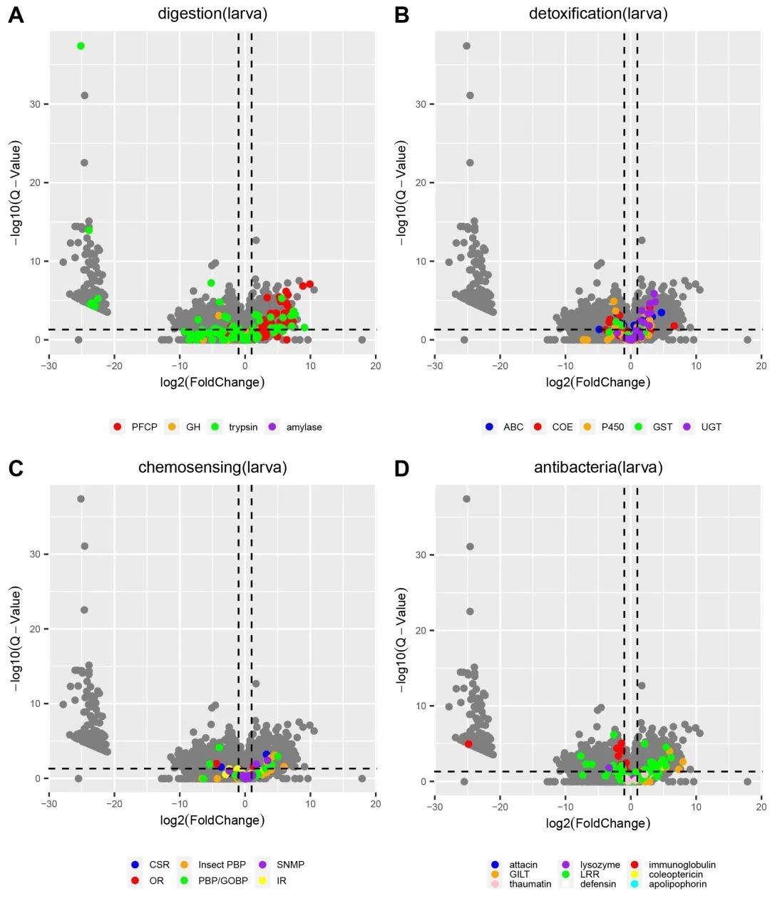 以往的研究表明,这些功能基因通常与捕食性甲虫的取食和适应相关,如利用化学感受器寻找合适的食物、消化酶分解食物、而取食不同食物时免疫反应也不同,因此研究者们推测这些基因家族可能对小短角瓢虫取食和适应吹绵蚧具有重要作用。