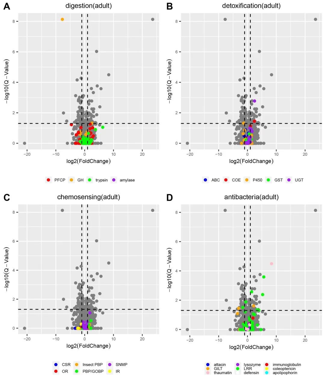 另外,小短角瓢虫的幼虫在取食吹绵蚧时,其上调的差异表达基因主要富集在与化学感受、解毒、免疫和消化等功能;而成虫中差异表达的基因相对较少,主要与免疫功能相关。说明它们可能采用不同的机制来应对来自猎物的胁迫。