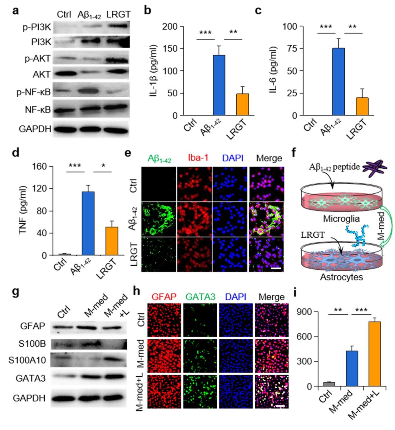 图1:利拉鲁肽降低小胶质细胞NF-κB的磷酸化水平(a),减少促炎因子浓度(b-d)并促进Aβ蛋白的清除(e);利拉鲁肽抑制小胶质细胞对星形胶质细胞的激活(f-g),通过转录因子GATA3(h)促进IL-3的分泌(i)
