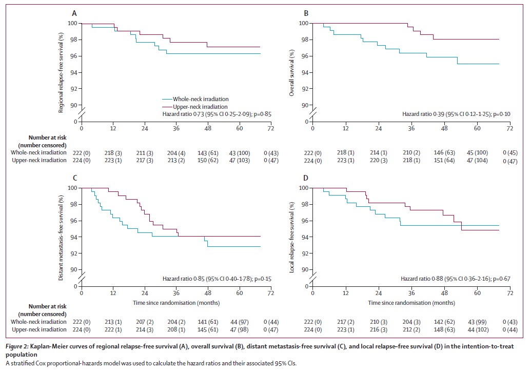 两组间的急性放射相关毒副反应相似,但上颈部照射组晚期毒性的发生率比全颈部照射组低(见下表),包括任何级别的甲状腺功能减退(30% vs 39%)、皮肤毒性(14% vs 25%)、吞咽困难(17% vs 32%)、颈部组织损伤(23% vs 40%)。