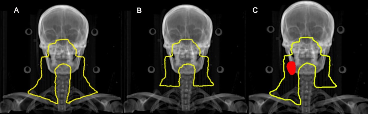 C:试验组:单侧淋巴结转移(红色区域),淋巴结阴性侧行上半颈部照射