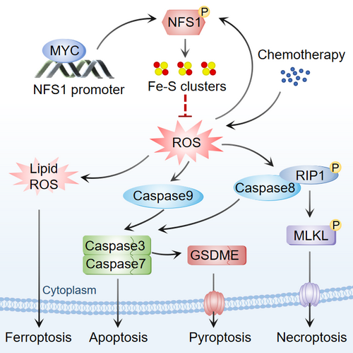 该研究发现了结直肠癌细胞对奥沙利铂耐药的新机制,铁硫(Iron-sulfur, Fe-S)簇合成酶半胱氨酸脱硫酶(Cysteine desulfurase, NFS1)依赖其Ser293磷酸化水平抑制结直肠癌细胞发生多种细胞死亡(PANoptosis),进而降低肠癌对铂类的敏感性,半胱氨酸脱硫酶缺失可增敏肠癌细胞对奥沙利铂的敏感性。
