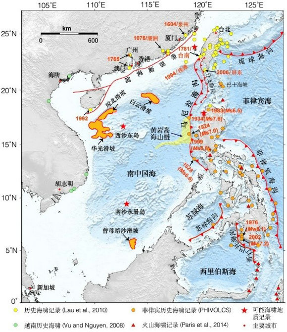 图1 南海海啸历史记录、地质记录及主要潜在海啸源分布