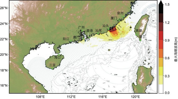 研究详细分析了南海域内典型海啸源触发的潜在灾害特征,指出马尼拉俯冲带地震产生的海啸主要对南海沿岸10°~25°N之间产生较大的灾害性影响,包括菲律宾、中国和越南的海岸线受马尼拉俯冲带地震海啸威胁较大,其中广东广东省沿海的潜在海啸灾害最严重。