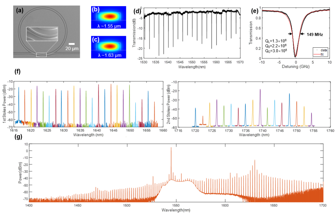 图2 不同结构中的片上集成拉曼激光输出谱。(a)-(e) 高品质硫系微环腔。(f) 级联拉曼激光输出。(g) 宽带拉曼-克尔频率梳输出。