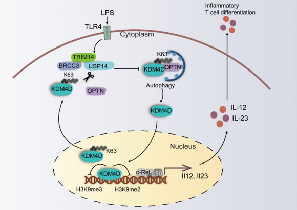 综上所述,该工作揭示了TRIM14-USP14-BRCC3蛋白质复合物在炎症应答过程中通过去除组蛋白去甲基化酶KDM4D的泛素化修饰,抑制货物识别受体OPTN对KDM4D的选择性自噬降解,通过影响组蛋白甲基化修饰,促进特定炎症因子的表达,从表观遗传水平调控炎症反应的分子机制。