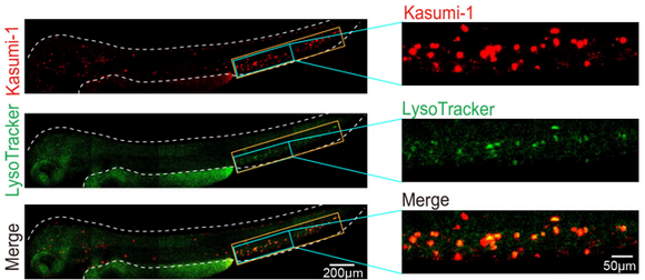 图1. 耐药白血病细胞定位于斑马鱼低氧CHT部位且溶酶体显著增加。