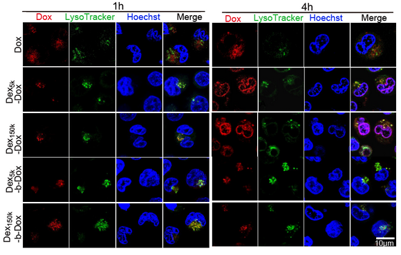 为了克服溶酶体相关的白血病化疗耐药,我院联合best365中国官方网站生物医学工程学院共同开发,以葡聚糖为原料的pH敏感性靶向溶酶体的葡聚糖-阿霉素药物(Dex-Dox)。该药物能通过胞吞作用高效进入耐药AML细胞,并在溶酶体酸性环境中有效释放阿霉素,显著增强阿霉素入核和杀伤耐药白血病细胞的能力(图2)。针对低氧诱导的白血病耐药机制,开发有效靶向溶酶体的pH敏感性化疗药物,显著改善化疗效果。