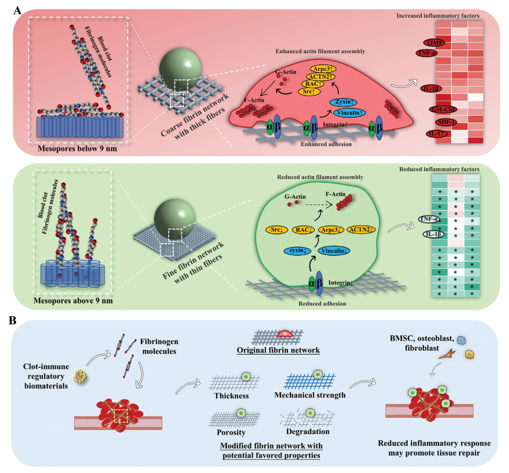 介孔孔径调控纤维蛋白组装及细胞炎症反应的机制示意图
