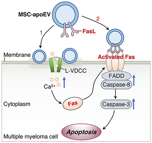 该研究发现,MSC凋亡过程中产生的凋亡囊泡表面高表达细胞死亡相关信号如FasL等。并发现:(1) 全身输注MSC来源凋亡囊泡可显着延长多发性骨髓瘤小鼠的寿命,挽救溶骨性病变,改善肾损伤;(2)凋亡囊泡在体内外均可诱导多发性骨髓瘤细胞凋亡,抑制肿瘤细胞生长;(3)凋亡囊泡直接接触肿瘤细胞,通过诱发Ca2+内流促进Fas从细胞质转运到细胞膜表面;(4)凋亡囊泡利用其膜表达的FasL激活肿瘤细胞中恢复正常的Fas通路以启动细胞凋亡。研究揭示了凋亡囊泡在诱导肿瘤细胞凋亡中的作用,并提出凋亡囊泡以一种“一石二鸟”的策略治疗多发性骨髓瘤的新方法。这一发现为理解细胞外囊泡与肿瘤相互作用增加了新的认识,也为修饰凋亡囊泡、开发新的肿瘤治疗方法开辟了道路。
