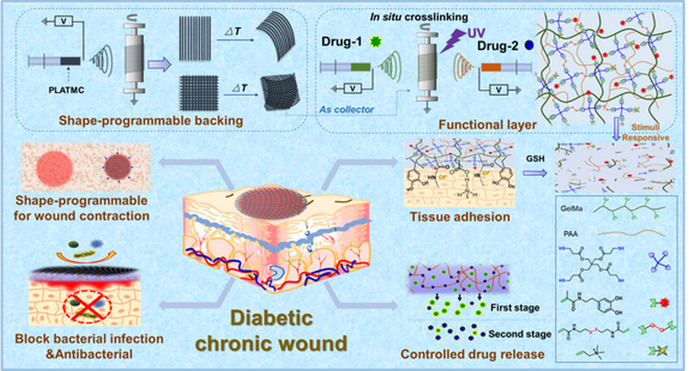 为解决上述科学问题,best365中国官方网站附属口腔医院夏娟和李卫昌团队针对糖尿病创面的修复需求,开发了一种形状可编程层级结构复合膜体系(图释),通过协同调节炎症微环境有效促进糖尿病创面的修复与再生。具体而言,该复合膜体系主要由静电纺丝构建的支撑层和功能层组成,其中支撑层可通过形状记忆机制实现对组织创口的双轴机械主动收缩,在促进修复过程中防止创面的扩张。功能层内部层级结构可有效控释不同功能的药物梯度释放,满足创面不同修复时期的特异性需求;其抗菌/抑菌纤维网络结合抗菌类药物对糖尿病创面典型的慢性炎症有较好的抑制作用;此外,具有粘合功能的活性化学位点设置可将膜体系稳定黏附于组织表面,而高分子网络中引入的响应官能团可通过刺激破坏纤维网络结构,实现粘合界面的灵活分离。论文重点探究了高分子纤维网络结构对材料体系宏观性能的影响规律以及对糖尿病创面的修复机制,并通过理化性能测试、生物学检测、动物实验等手段,系统评价了其应用的灵活性、安全性和有效性。本研究为临床糖尿病创面的治疗提供了一种新的解决方案,有望加快实现功能型创面修复体系在生物医学领域的应用突破和产业链延伸。