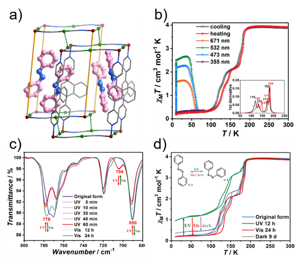 图1 a) 霍夫曼型MOF框架和光活性客体结构图;b) 四步自旋交叉性质和光致激发自旋态捕获效应;c) 紫外和可见光照射下的红外谱图;d) 客体驱动光诱导自旋转变。