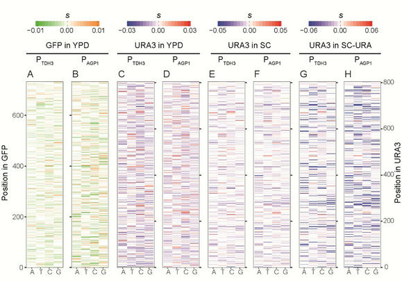 为了解决上述问题,陈小舒教授团队与杨建荣教授团队设计了一种新的实验方法来大规模测定蛋白质编码基因的所有单核苷酸突变的表型效应。团队使用该方法测定了绿色荧光蛋白 GFP(一个外源基因)与 URA3(一个在特定条件下必需的内源基因)两个基因内几乎所有突变,在两个活性相差10倍的启动子控制下的表型效应。研究发现(i)基因内至少42%的突变会因表达量改变而呈现不同的表型效应;(ii)与低表达时相比,必需基因高表达时更能容忍突变对基因功能的削弱作用;(iii)由于各种随机分子错误,基因表达升高会增强突变带来的细胞毒性。因此,上述结果直接证实了基因突变的表型效应具有表达依赖性,为理解上位效应的分子机制,和对基因组数据的精准解读提供了新的理论基础。