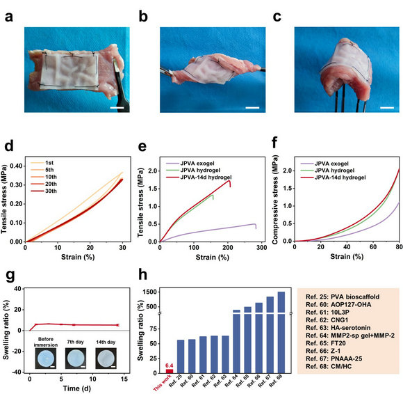 图2. 超结构多孔水凝胶JPVA的力学性能和抗溶胀性能。(a-c)缝合了超结构多孔水凝胶JPVA的猪肉照片,可以适应各种不同角度的“造型”,证明水凝胶的高柔性。
