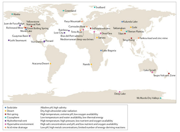 中大新闻网讯(通讯员黄立南)地球上广泛分布着包括地热泉、深海热溢口、冰冻圈、高盐生境、深地以及矿山酸性废水等各种极端环境(图1)。尽管理化条件严酷,这些生境给来自所有三个生命域的众多微生物提供多样化的生态位。这些独特的微生物进化出了不同的策略以应对多种极端环境胁迫,定义地球生命的物理和化学极限,并吸引了从基础理论到生物技术应用方面的大量研究。此外,由于其高度简单的生物学组成,不依赖于培养的微生物组学分析的整体可操作性,以及紧密的地球化学和生物学过程的耦合,一些极端环境(如美国加州Richmond矿内部的极端嗜酸生物膜、黄石国家公园碱性热泉中的蓝细菌菌席、西班牙Santa Pola多级太阳能盐田的微生物群落、南美Atacama沙漠岩盐中的嗜盐微生物等)是研究微生物生态、进化和环境适应性的理想目标。有鉴于此,极端环境一直是微生物生态学和环境微生物学的重要学科前沿。