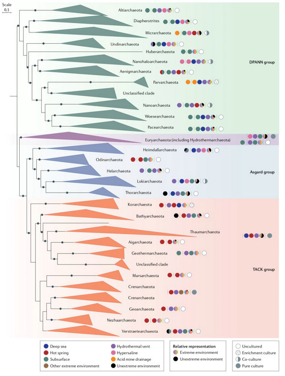 图2 基于NCBI数据库中所有古菌基因组的系统树,展示目前已知的主要分枝(门水平)。带颜色的圆圈从左到右依次表示其首次基因组采样的生境,每个门所有基因组的生境分布(显示3种最多基因组的极端环境),以及培养情况(未培养、富集培养、共培养和纯培养)。