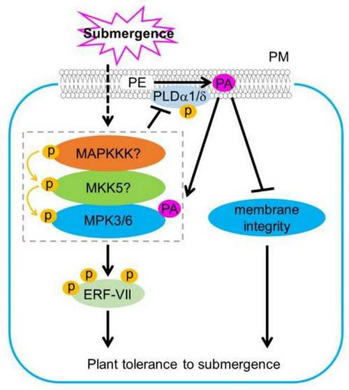 研究表明,乙烯反应转录因子ERF-VII家族蛋白与膜相关ACBPs蛋白互作锚定在质膜上。在水淹条件下,植物通过低氧诱导产生多不饱和acyl-CoA信号分子及依赖于类泛素化N-末端蛋白质降解机制,来实现对低氧胁迫的动态感知和应答,这些发现为植物脂代谢或脂信号分子参与调控低氧响应研究开拓了新思路。前期研究发现,植物中另一脂信号分子磷脂酸(PA)在低氧响应中显著积累,但PA如何参与植物低氧信号通路还不清楚。