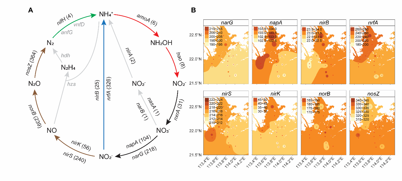 氮循环是地球上最重要的生物地球化学过程之一。自然界中,氮可以以多种价态(-3到+5)存在,不同价态之间的转换主要是由微生物所驱动。目前我们对微生物氮循环功能基因的生物地理分布还缺乏足够的认识,这一定程度上阻碍了对自然界氮循环的系统性理解。