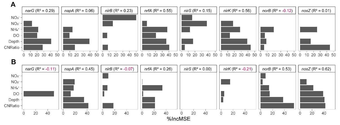 图3. 环境因子在解释功能基因多样性(A)和丰度(B)变化中的重要性