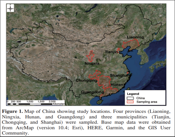图1. 研究地点分布图(研究地点包括辽宁省、宁夏回族自治区、湖南省、广东省、天津市、重庆市以及上海市)