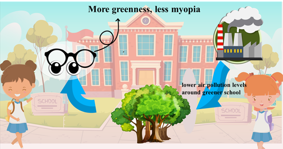 图2. 研究结果汇总(学校绿地水平越高,其学生近视患病风险越低)