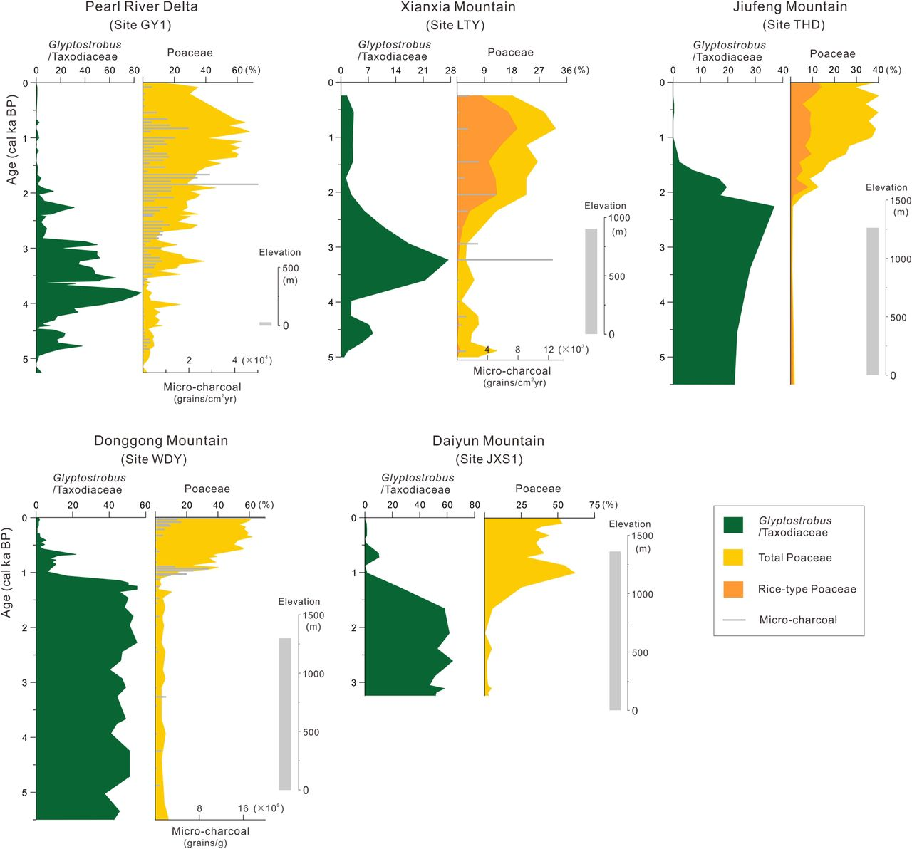人类从渔猎-采集模式过渡到水稻农业的新石器时期,被认为可能是对热带生物多样性产生重要影响的关键历史时段。前人研究认为水稻农业在距今4-5千年前传播到亚洲东南部,部分考古遗址中曾发现该时期的水稻遗存,但仅在距今约2千年前,随着海平面下降和诸多大三角洲平原(例如珠江三角洲)的形成,水稻农业才开始在该地区快速扩张,并从低海拔地带向丘陵山区发展。同时,人类耕作活动引发的森林火灾频率增高,造成区域森林覆盖率减少以及木本植物群落生物多样性降低。
