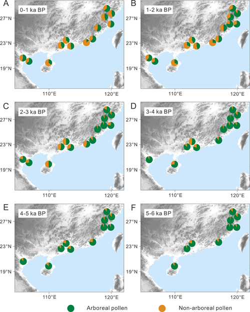图1 花粉记录显示距今2-3千年前后森林覆盖(绿色)显著减少,与华南水稻农业的扩张时代基本吻合