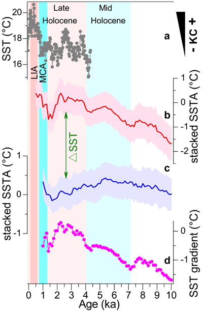 研究团队利用长链烯酮标志物方法,重构并分析了冲绳海槽沉积岩芯柱中的海表温度(SST)信号(图1),并结合现有SST研究记录和数据。结果发现,在约3/4千年的晚全新世时期以来,KC/NPSG明显增强(图2)。