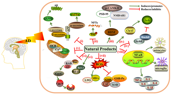 全球估计有3000万人患有痴呆症,其中大多数是阿尔茨海默症(Alzheimer’s disease,AD)患者,AD已成为21世纪全球健康和公共卫生的主要问题之一。尽管临床上有一些治疗AD的药物,但其疗效不理想,而且存在一定的副作用,如肌肉痉挛、头痛、嗜睡和心律失常等。因此,迫切需要新的防控策略来减缓AD的发生。水果、蔬菜、草药、坚果、茶和大型真菌等天然产物具有很高的营养价值,其中一些天然产物在预防和治疗AD方面有着巨大潜力,如苹果、蓝莓、葡萄、辣椒、淫羊藿、海参、绿茶和普洱茶等。天然产物对AD有益效应的潜在机制包括减少Aβ沉积、抑制Tau蛋白过度磷酸化、缓解突触功能障碍、降低AchE和BuchE活性、增加ChAT活性、抑制细胞凋亡、改善线粒体功能、减轻氧化应激、改善炎症和重塑肠道菌群等。本文为天然产物在预防和治疗AD方面的潜在应用提供了理论依据和新的视角。