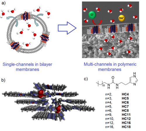 早在2011年,欧洲膜研究所知名学者Mihail Barboiu教授团队就开发了一类含咪唑功能基团的化合物,它们可通过咪唑、水分子、脲基之间的氢键作用自组装形成孔径约为2.6 Å的咪唑四聚体水通道(I-quartet channels),烷基“尾巴”的疏水作用使其在细胞膜中稳定存在(图1)。同时,它们可以选择性地传输水并且排斥离子。