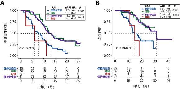为了探索血浆中的基因组演化对临床结局的影响,研究团队进一步发现,在循环肿瘤DNA中发生RAS/BRAF突变清除的患者与保持RAS/BRAF野生型的患者显示出相似的无进展生存期(PFS)和总生存期(OS),而比保持RAS/BRAF突变型的患者的生存结局要好得多。相反,获得新的RAS/BRAF突变的患者的预后与保持RAS/BRAF突变的患者相似,而与保持RAS/BRAF野生型的患者相比则更差。