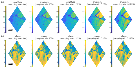 压缩传感下的单像素复振幅成像,待测样品为未染色鼠脑组织切片(a)-(b)在不同采样率(50%、25%、12.5%、6.25%、3.125%)下的复振幅成像。