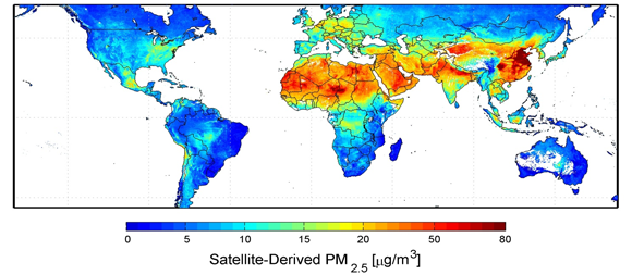 图1 通过卫星获取的全球PM2.5图谱(μg/m3)